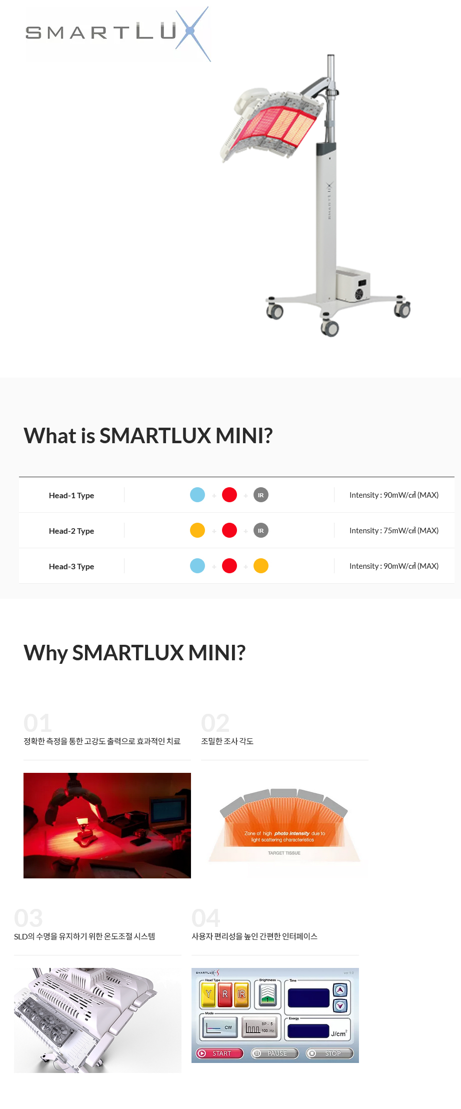 스마트룩스 미니는 저출력광선조사기와 적외선조사기가 조합되어 사용되는 2등급의료용조합자극기로, 전기적 에너지가 인가되면 635㎚(RED), 420㎚(BLUE), 585㎚(YELLOW) 파장을 가진 가시광선 LED 램프와 830㎚(IR) 파장을 가진